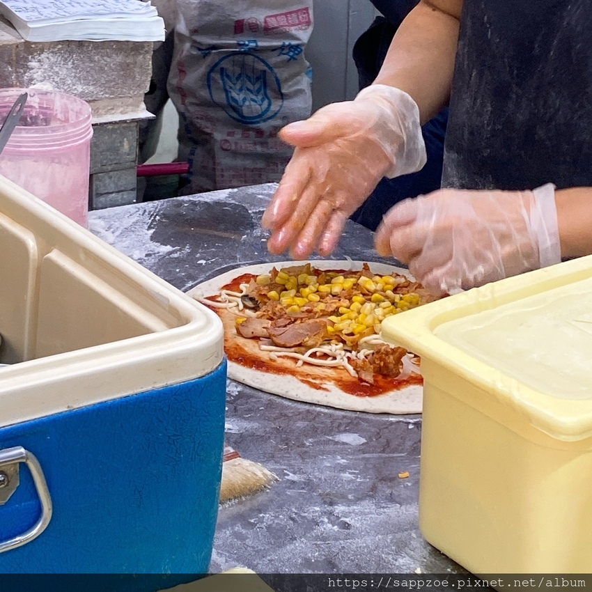 🔺抹上番茄醬後以洋蔥、起司、蘑菇為底