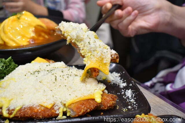 滿滿的起司粉搭上起司片,覆蓋於里肌豬排上,吃起來起司香氣濃郁,里肌豬排肉質紮實飽滿,香氣四溢的歐姆蛋,搭上特製咖理醬汁,組合起來的口感豐富,而且多元化,可以吃到香濃的起司同時結合歐姆蛋咖理的香氣,第一口的重磅起司里肌豬排,就讓Lulu直呼:好吃欸!
