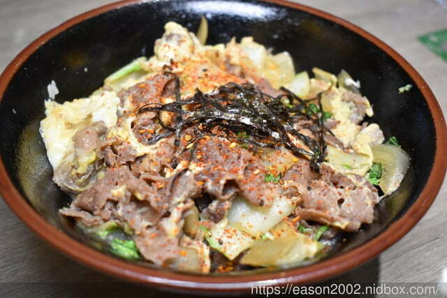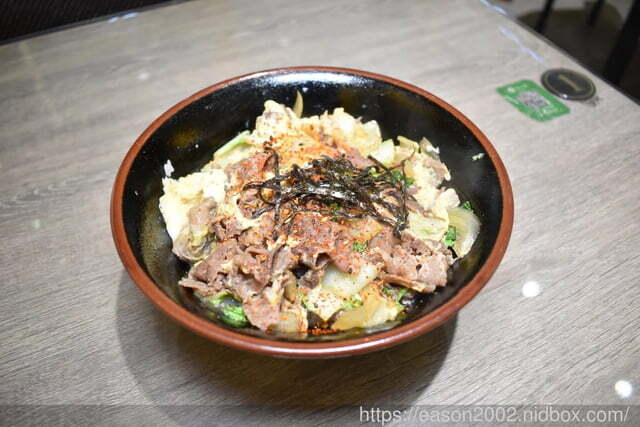 特殊的日式醬汁,深入整碗蓋飯裡,上層的雙層牛肉搭配微辣的孜然粉,讓整體牛肉蓋飯增添風味,吃起來微濕潤的口感,搭配新鮮滑蛋的軟嫩,吃起來跟一般丼飯不太一樣。