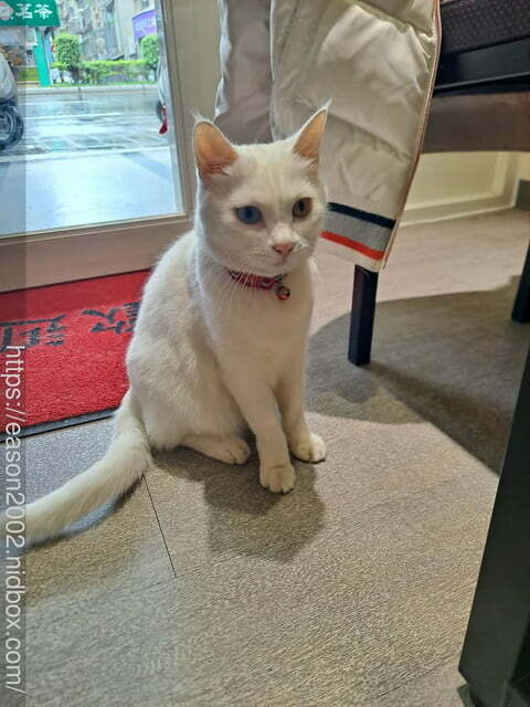 如果剛好運氣好的話,還可以巧遇店貓,(客人多,貓咪不一定會走出來),我們在用餐結束後,剛好遇到白色的喵喵,非常親人可愛,怎麼摸他,跟他玩都不會生氣,乖乖讓你摸,真的好可愛,而且他的雙眼還是不同顏色喔~