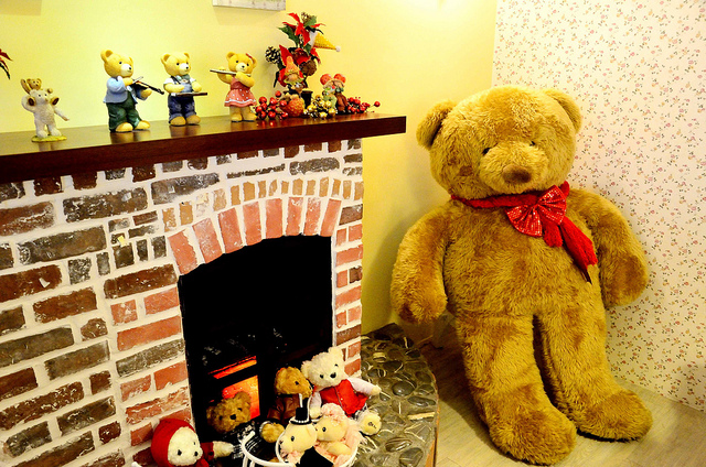 角落還有一個壁爐呢,上面擺了許多熊熊的擺飾