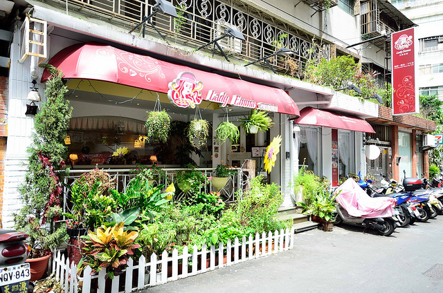 大紅顏色的LadyEmma招牌,還有一個可愛的小圍籬花園