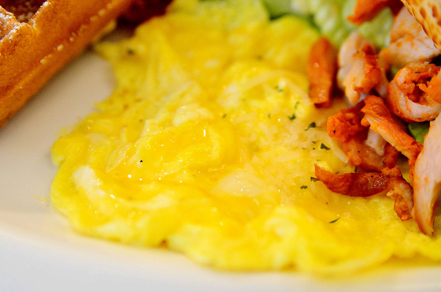 生菜沙拉,三明治,炒蛋,鬆餅的組合