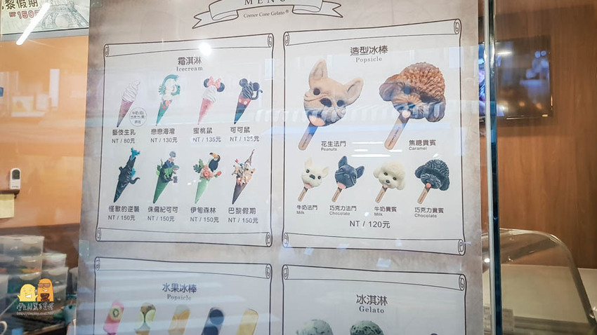 在台北淡水有一家冰店CornerCone酷礦美式手作霜淇淋,裡面的造型冰棒超可愛!有法鬥、有貴賓,甚至還有夢幻造型冰淇淋!就連毛髮也超及精細~精雕細琢的程度有點驚人,口味也還OK,就是價格偏高一點點,畢竟造型特殊啦~