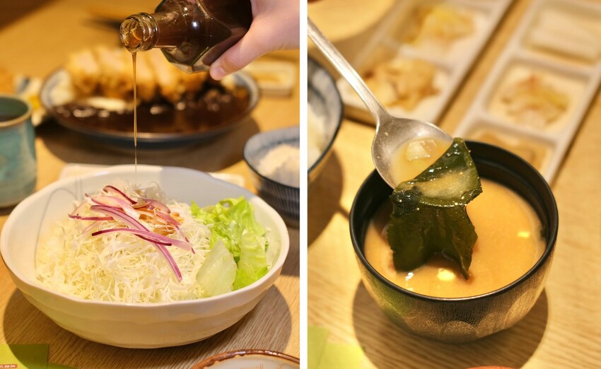 ▼餐前會先上一大份高麗菜絲,選用高山品種吃起來新鮮甜脆 ;味噌湯裡面有海帶和豆腐配料,湯頭屬於偏鹹的調味,以上都是無限供應讓人能夠吃飽飽~