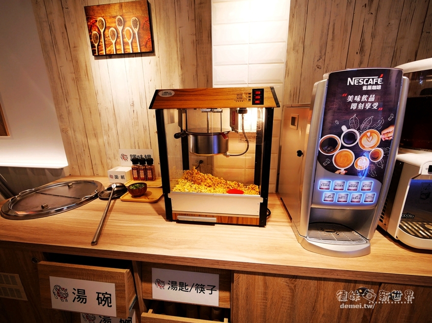 有蔥花可加的味噌湯、爆米花、雀巢咖啡機供多款熱飲,