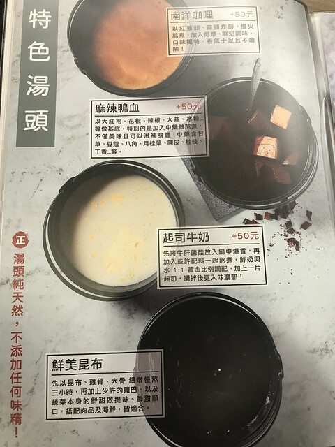 起士牛奶鍋、麻辣鴨血鍋、剝皮辣椒鍋、養生蕃茄鍋、南洋咖哩鍋等等