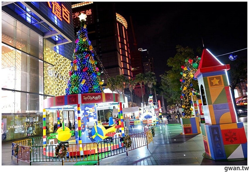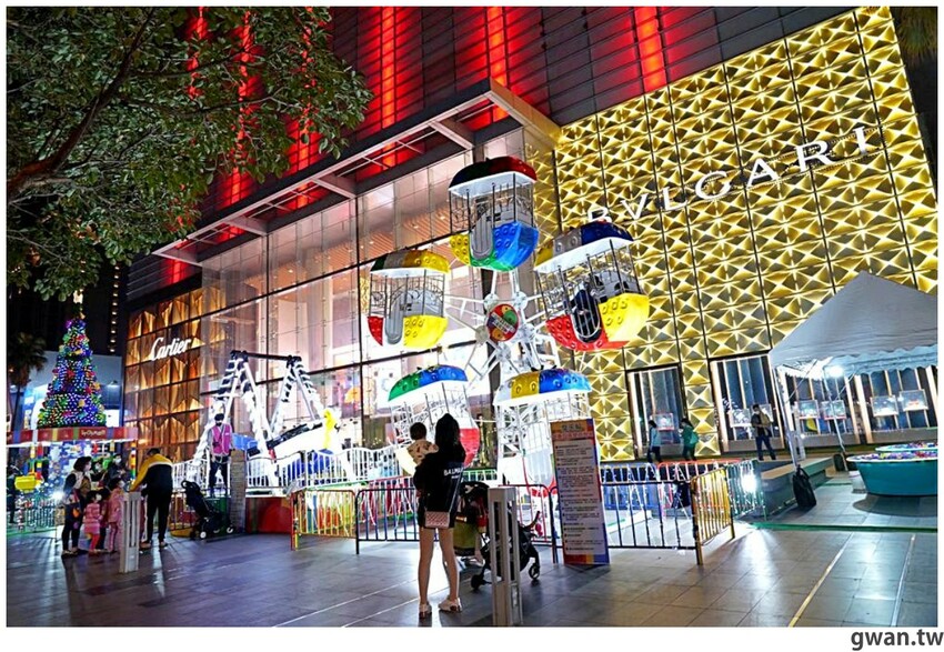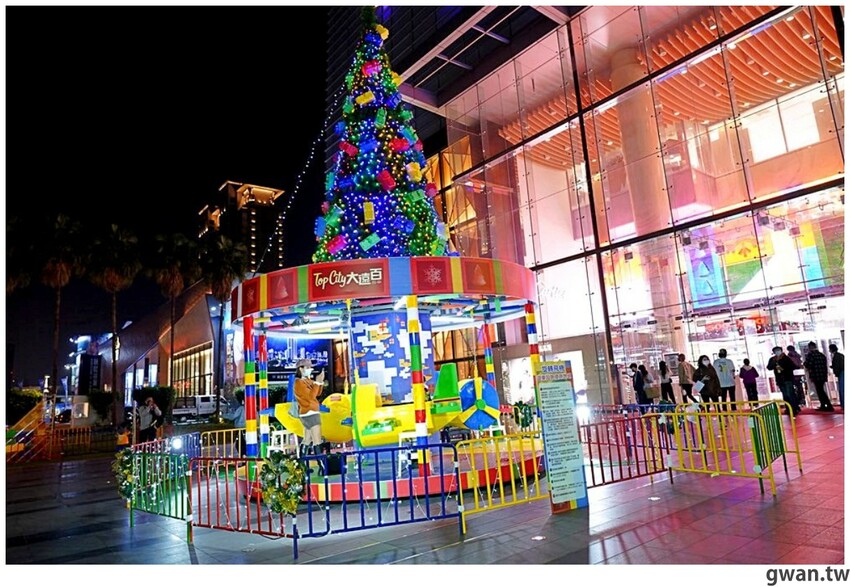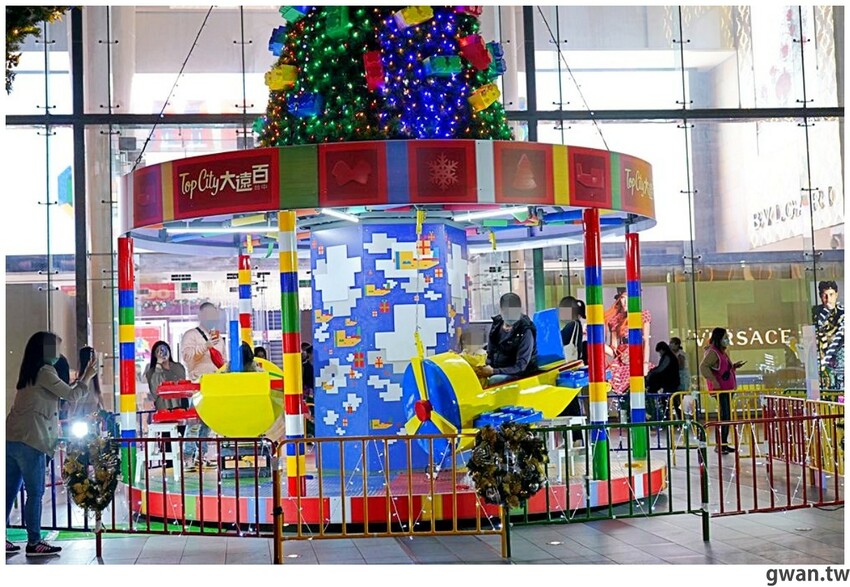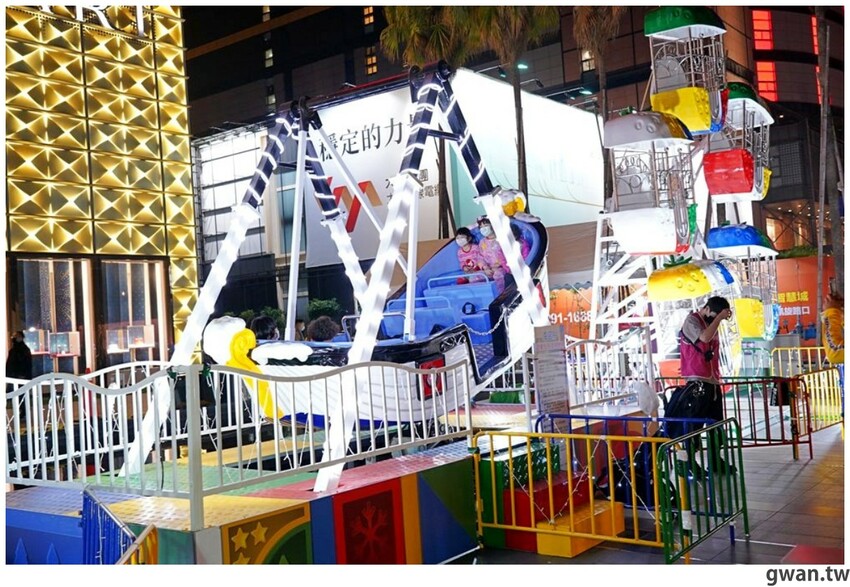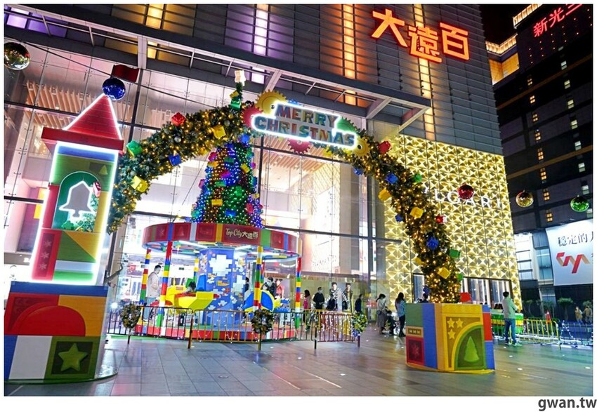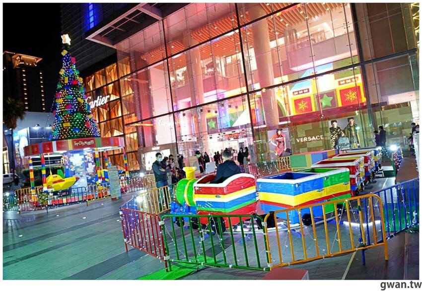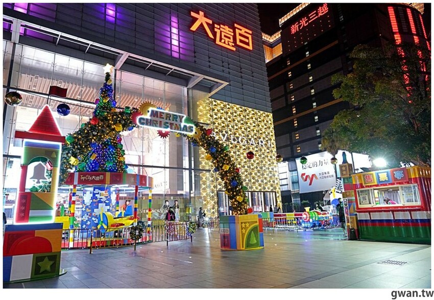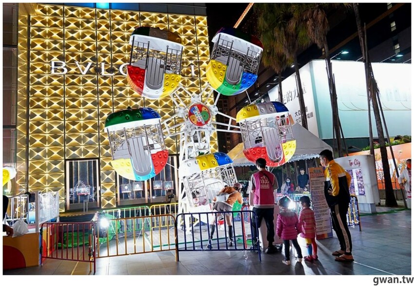 2021台中大遠百聖誕造景亮相囉!今年以彩色積木打造一座繽紛的積木樂園,白天夜晚兩種風情都好拍,飛機木馬、摩天輪、海盜船、迷你火車、釣魚樂,五種遊樂設施可以搭乘,聖誕將至,很多爸媽帶小朋友來感受濃濃的耶誕氣氛,小朋友都笑得好開心