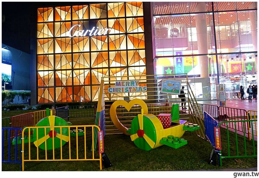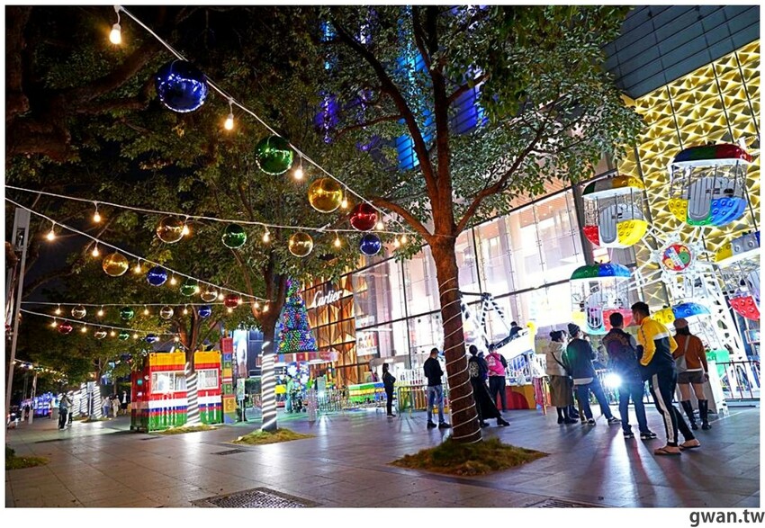 連旁邊的人行道上都掛上聖誕彩球,營造濃濃的耶誕氣氛!台中最新的聖誕景點,大遠百廣場前的繽紛奇積樂園,旁邊也有新光三越的夢幻雪白聖誕,快找時間來拍一波吧