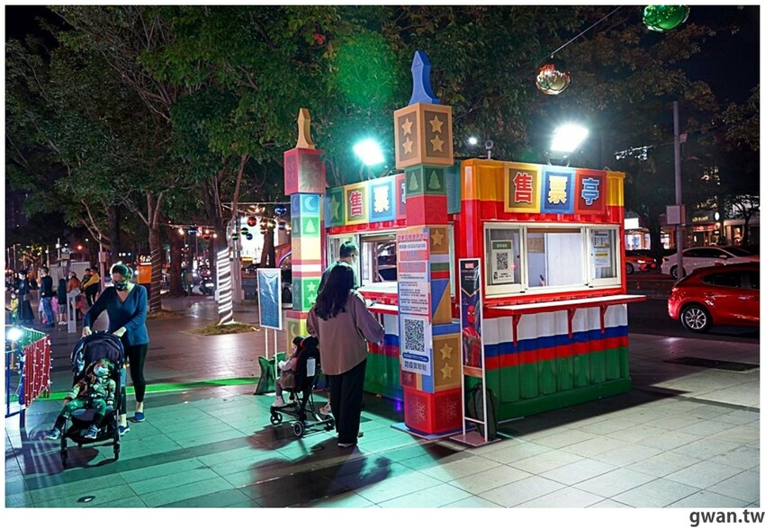 售票亭旁邊的聖誕拱門就是很熱門的打卡點,仔細看~會發現花圈上還有彩色積木裝飾喔