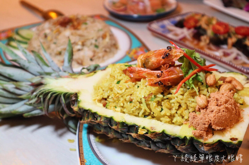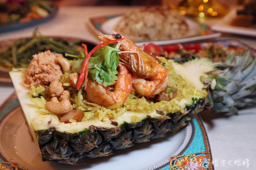 是不是很少看到整顆鳳梨入菜呀!這道真的是視覺與美味兼具的料理,炒飯粒粒分明,每口充滿濃郁的咖哩味,另外還有加入新鮮的蝦子,最妙的是竟然加入腰果、肉鬆和香腸,意外地好吃耶!