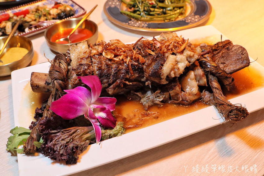 在這樣高檔的餐廳裡,烤肉串一串才賣$45元算是很便宜!清邁烤豬肉串選用梅花豬,刷上甜甜的醬汁還蠻好吃的!軟嫩帶汁的薑黃烤雞肉串,可以搭配沙嗲醬一起吃!至於醬烤沙嗲牛肋條串上頭有灑一點花生粒增添香氣,牛肋條咬起來頗有嚼勁,一樣可以沾著沙嗲醬。