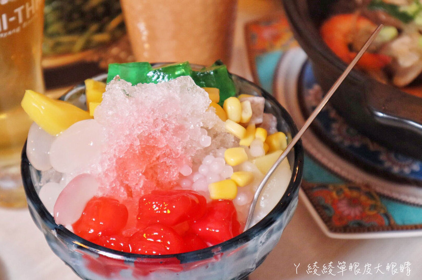 在東南亞頗具代表性的甜點-摩摩喳喳,色彩繽紛極了!在冰沙上加入經典的芋頭塊、西米、亞答枳、紅毛丹、龍鳳果、波羅蜜,均帶有各自的口感,很特別的是還加了紅石榴果凍、綠果凍跟玉米,最後淋上香濃的椰奶,整體口味挺奇妙的,可以點來吃看看。