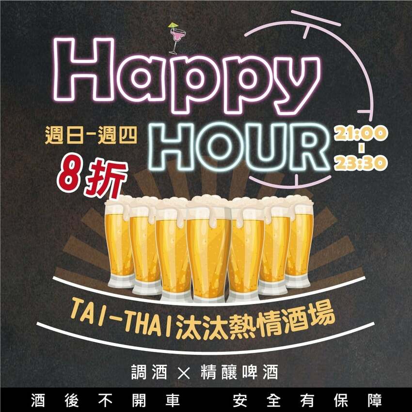 即日起至2021/12/31,每週日到週四晚上9點到11點30分,6款寶島精釀啤酒(杯/酒柱)、8款調酒系列全品項8折!(喝酒不開車,未滿十八歲請勿喝酒)