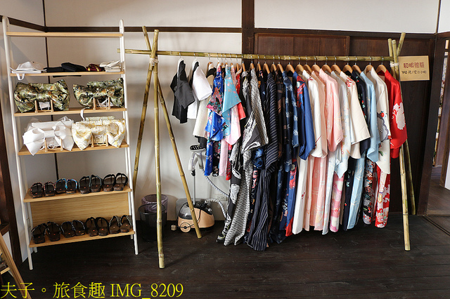 整套的和服體驗 (NT$350/人,二小時),包含浴衣服裝、腰帶、髮飾、白襪 (贈送可攜回)、木屐等全套衣著,並有老師現場指導、幫忙穿著,除了能在東村宿舍拍照外,也可以穿著和服到老郵局、乃木崎或桂花巷拍照。