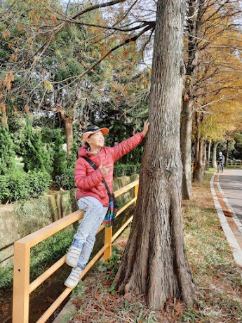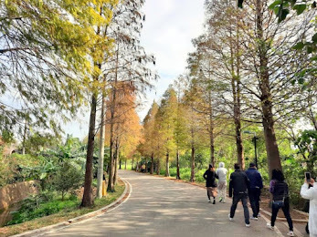 入冬時節,午後漫步在落羽松大道,雖還未人潮竄動、前仆後繼....然落雨松大道、浪漫台三線的鮮豔立牌,已經讓我們精神大振,連拍搶鏡啦!!幸好遊客不多,小販未蜂擁而至,整片綠油油的田野風情,讓心情豁然開朗。老天作美風和日麗,眺望著漸層變黃的落雨松,層次之美讓人動容。路樹、欄杆、小溪、落葉....在此刻都顯得頗有意境...車流不算多,遊客還未逢時機,小販也是點綴為之,不過遊客挺夠意思,路過大多都會挑些蔬果順手帶回~~路邊右側有一大片芒草,遍野開滿銀白色的芒花,藍天白雲襯底,白色芒花隨風飄搖;站在茂密的芒草中,我們也爭著與天地共享,這自然天成的風情~~好期待落雨松整片的璀璨之姿,蜿蜒有序的層次色調之美,元旦之際應該是陽光裡整片金黃,人頭接龍黑壓壓的對比~~