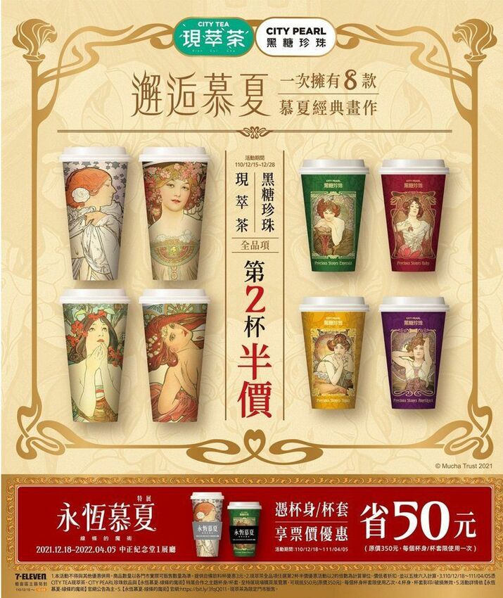 憑永恆慕夏X現萃茶&珍珠聯名杯身/杯套至特展現場購買展覽票,可限抵50元(原價350元),每個杯身限兌換一次喔!