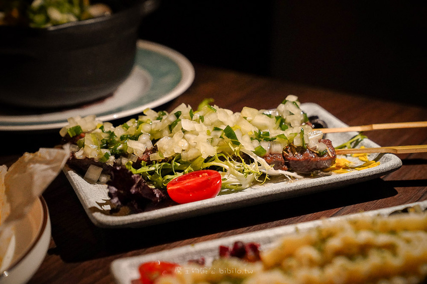 這也是我個人覺得要點的一道菜,洋蔥與青蔥的組合,我本來就很喜歡,這一道菜根本就是一上桌就吸引到我,松阪牛肉串口感一點也不會柴,肉質軟且邊咬邊有肉汁,即使單吃,也是很棒,不過搭配著蔥鹽一起吃,涮嘴且真的有夠適合喝酒。