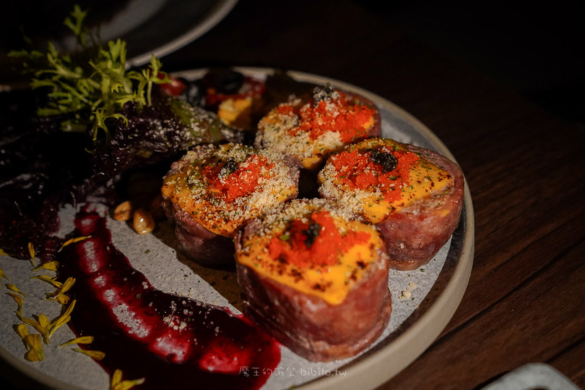 不得不說,隱士餐酒館系列的餐點,真的都非常有特色,且擺盤很漂亮,一旁是酸甜的覆盆子醬,可以增添不同風味層次,這一顆厚厚的培根肉捲,真的會飽,滿滿起司香味以及煙燻培根香,當開始覺得這兩者味道有些太重時,突然出現清爽的菠菜,層次感相當不錯。