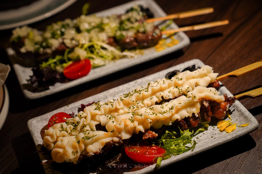 十足的創意料理,這一道下酒菜我覺得很像在吃甜點,雞皮烤的相當外脆內Q,很有嚼勁,焦糖醬烤的雞皮完整包裹著雞皮,配合綿密帶有點鹹味的馬鈴薯泥一起吃,稍甜的雞皮串會被馬鈴薯泥中和掉,算是我近期內吃到算是很很吃且極具特色的餐點。