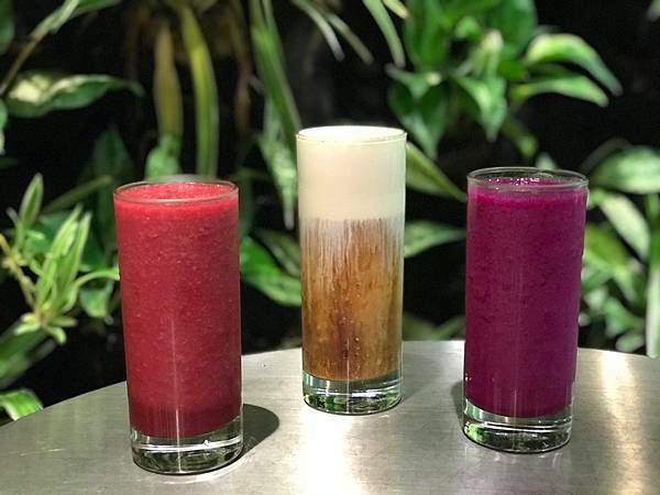 左邊紫色精靈180元-這個有多樣蔬果打在一起,波菜、羽衣甘藍、甜菜根、蘋果等,能量滿滿的蔬果汁,喝完補充滿滿纖維素