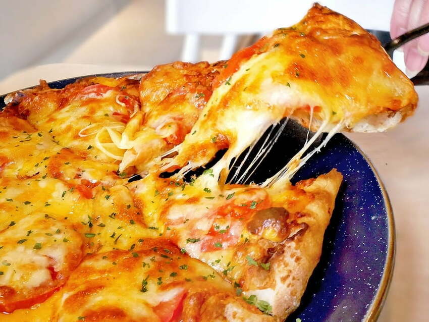 由三種起司組合的披薩. 趁熱取一片來品嚐. 香濃起司拔絲出完美且誘人的弧度. 入口綻放出鹹濃醇厚的起司味. 充滿層次