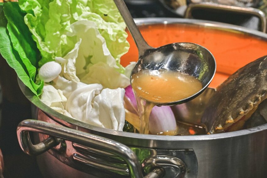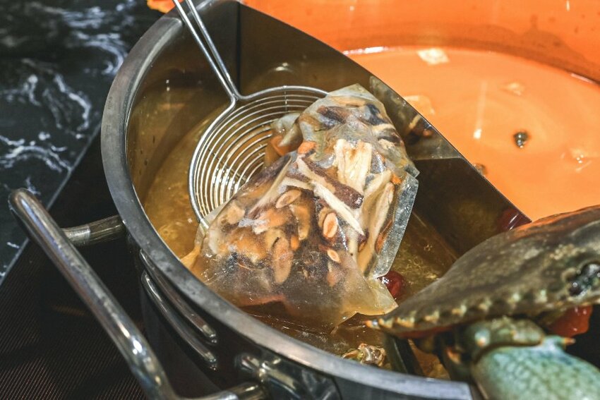 東雛菊招牌蟹黃湯頭使用大量蔬果、蟹身及蟹黃熬煮,再加入豬大骨、雞骨及蟹膏提煉成金黃色高湯,拌入秘制辣蝦汁,