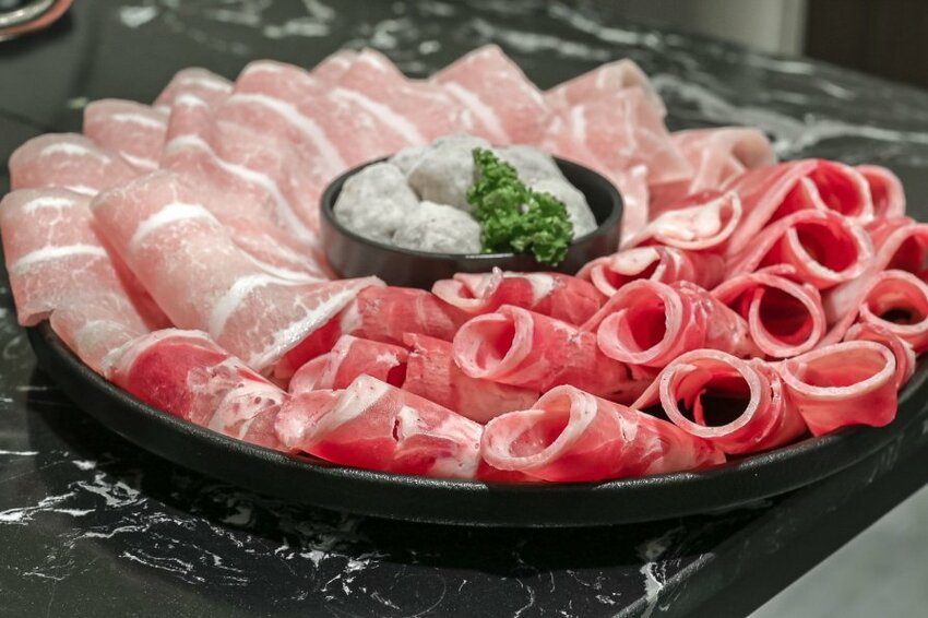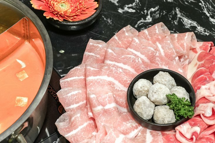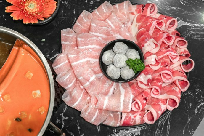 搭配是蟹黃椒辣湯頭與麻油湯頭都是冬季滋補口味,不喜歡也可免費更換成其他想喝的湯頭,還附上一盤肉盤內有台灣頂級櫻桃鴨、丹麥特級松阪豬、手工鴨肉丸與兩份菜盤。