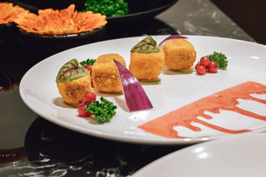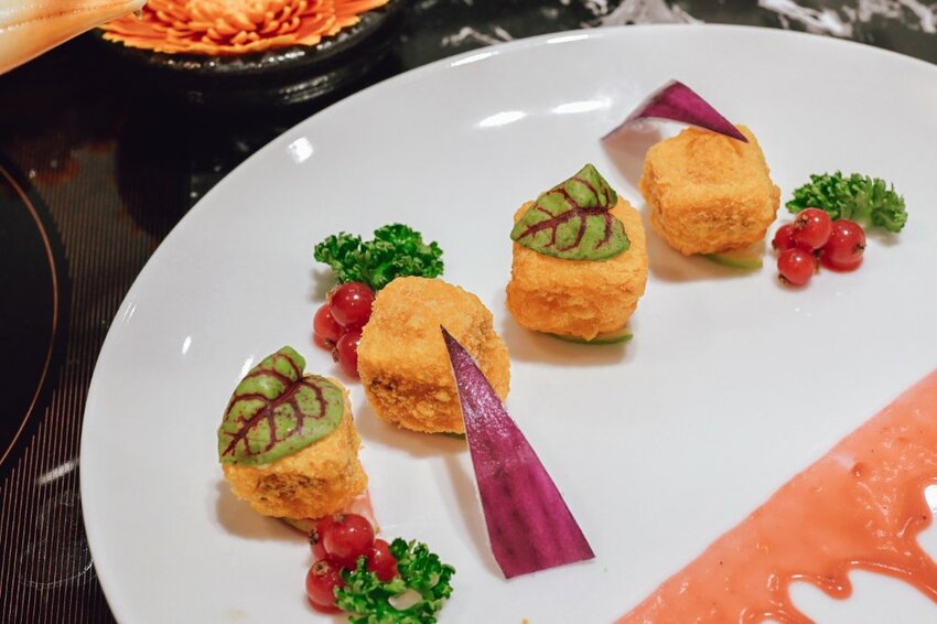 不僅鍋物美的如詩如畫,就連主廚秘製也如畫一樣,堪稱法式料理也不為過。在等火鍋之前先來品嚐,白盤放上一塊塊如炸豆腐,咬開酥脆的外皮裡面是滿滿蟹膏,滋味濃郁又香又滑。