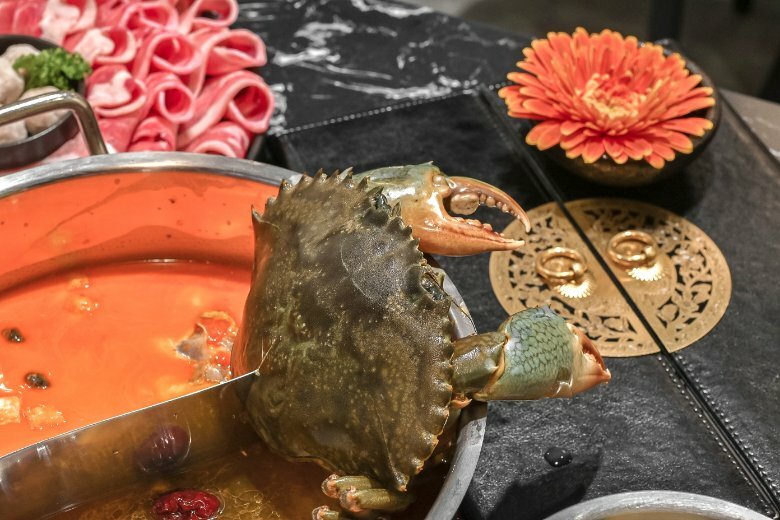 一上桌就霸氣十足的極鮮卵沙母螃蟹,一整隻在鍋物湯頭中間,像是探出頭來耀威風,又像是在泡湯的樣子超可愛。