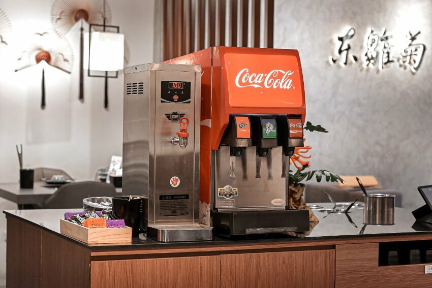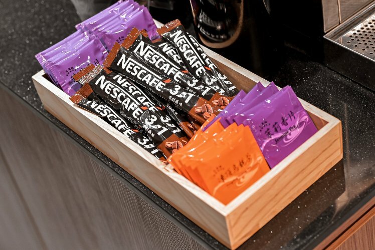 空間內正中央是飲料及醬料自助區,除了冰涼軟性飲料外還提供百年茶行烏龍茶與香片,想喝咖啡也有提供三合一咖啡即溶包。