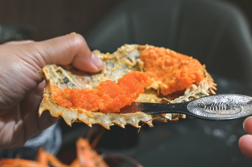 一翻開來極鮮卵沙母內有滿滿膏狀的卵,還沒煮下鍋光看就覺得十足的過癮,有夠邪惡的啦,滿口的蟹膏蟹黃,完全是將味蕾帶入海底,掀起巨浪,每一口都是爆炸極緻的鮮、極緻的甜,