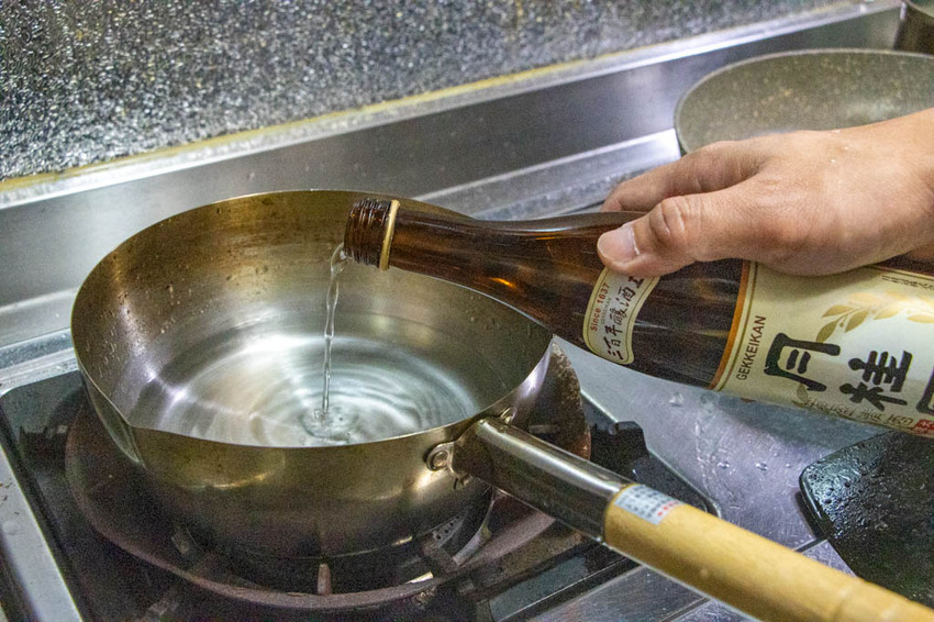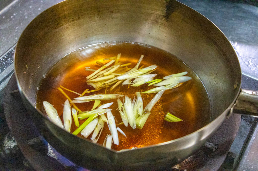 先將米酒、醬油、水、味醂、糖與薑、蔥白煮開,再放入味噌使其融入湯中。