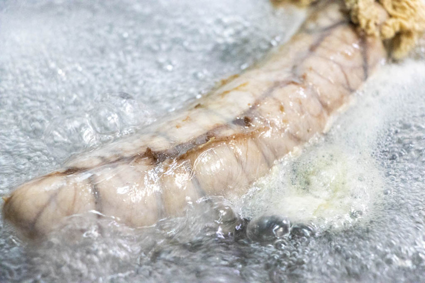 購買回來的魚蛋處理方式就是先將魚蛋略為解凍,整體清洗乾淨後,加些米酒先醃大約30分鐘。