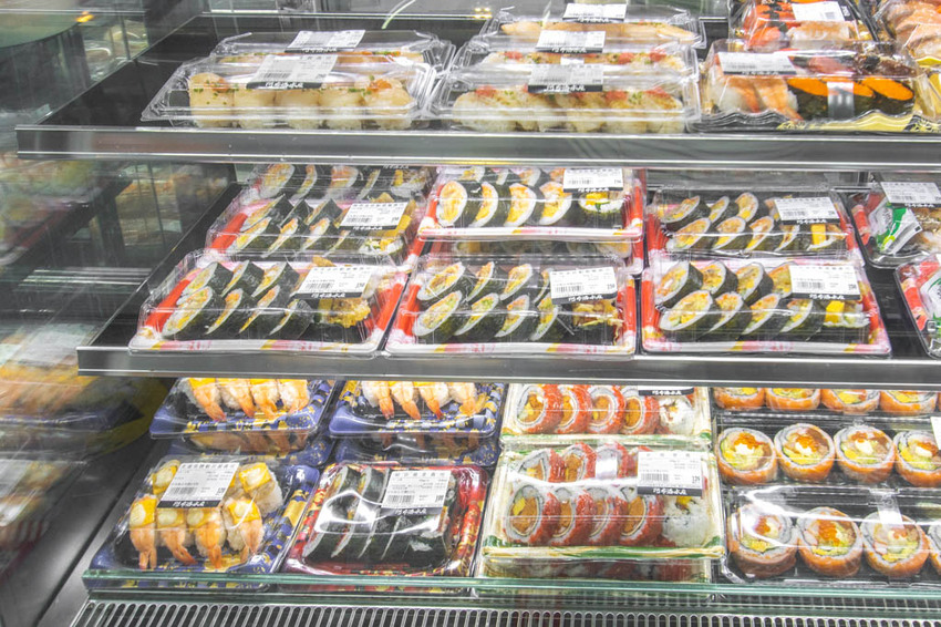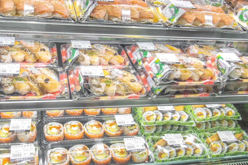 走道的另一側櫃子中,放了滿滿的漬物、壽司、握壽司、手卷專區與三明治。