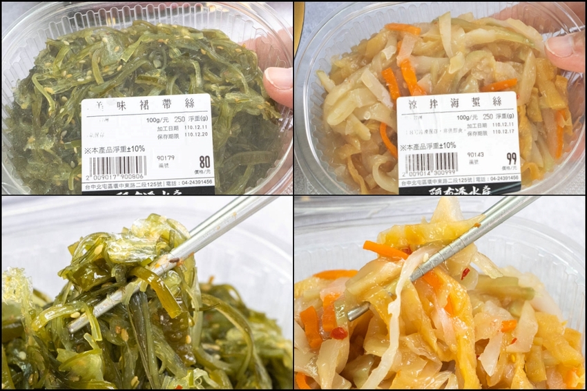 美味裙帶絲的風味較為脆爽帶甘,是屬於淡雅類型的涼菜,涼拌海蜇絲則較富有咬勁,單吃或是搭配其它食物也蠻推薦的。