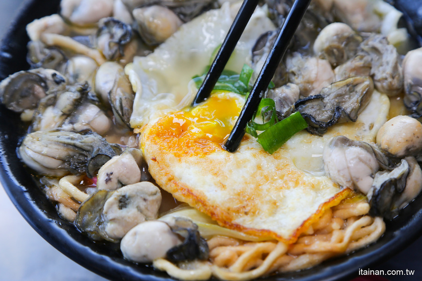 湯意麵裡面還有一顆半熟荷包蛋,戳破蛋黃把蚵仔沾著蛋液一起吃,香氣更勝。