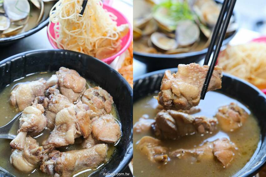 主角薑母雞湯選用的湯底是跟知名薑母鴨店合作的湯底,湯頭非常濃郁,雞肉給的量還不少,而且全部都是翅小腿,方便客人食用,因為不是以火鍋方式呈現,才會做成薑母雞,比起薑母鴨雞肉肉質相對軟嫩方便食用,重點是這一碗湯喝不夠都可以無限加湯,管你要加800次還是8000次,老闆說都可以啦!!