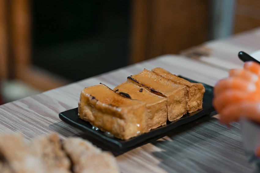 豆腐塗抹上味噌後炙燒,四塊像金磚一樣的豆腐送上,味噌鹹鹹甜甜、外脆內嫩,豆腐超多汁,有驚豔到我,這款強力推薦必點。