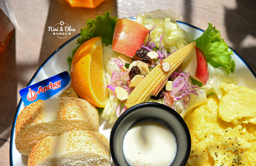這盤搭配的是柔軟炒蛋、薯塊、奶油軟法、生菜沙拉