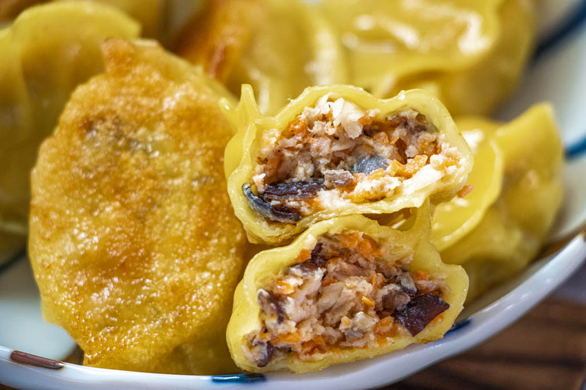 水餃外皮褶褶揉捏,看起來顆顆飽滿,黃與紅的色澤更是討喜,有點像是紅元寶與金元寶。