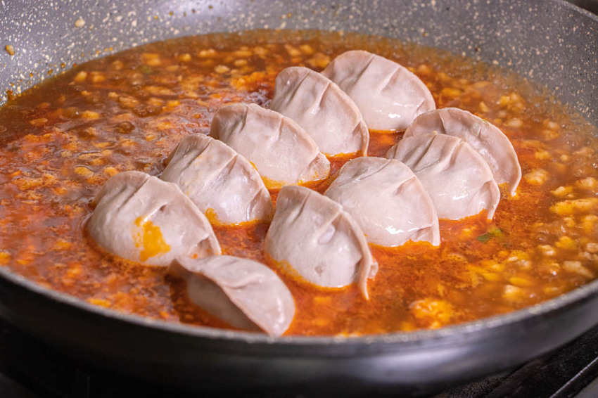 等到所有的醬料都炒熟後,加水約2-300CC,上蓋來悶煮水餃即可,時間上我是看蓋子都變透明後上桌,大約8分鐘。