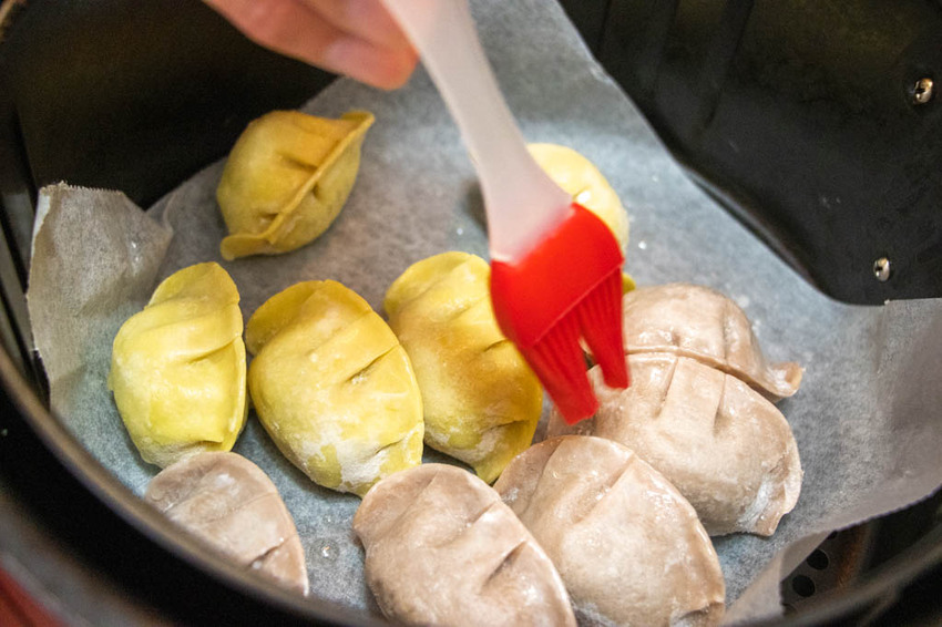 兒子一聽立刻自告奮勇要當刷油的小助手,只見他把Good Mall水餃們一個個刷好刷滿,將溫度調至180度氣炸8分鐘,就帶著期待的心情等待出爐。