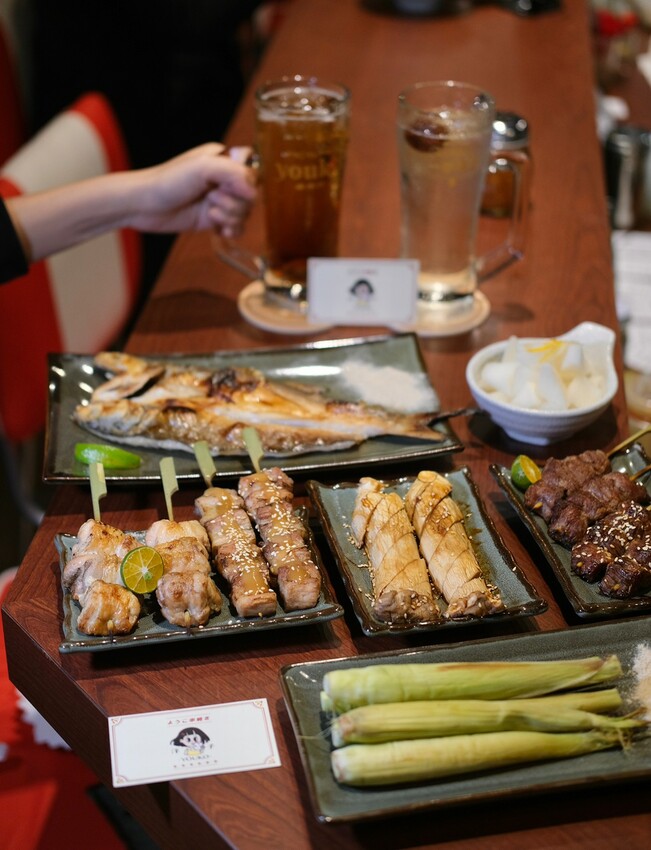 【 YOUKO 串燒き】,餐點品項種類繁多,供應烤物、炸物、燉物、涼拌等料理,主打雞料理,豚、牛肉、海鮮等為輔,還有甜點及酒精和無酒精飲品,價位從幾十元到百元價不等。