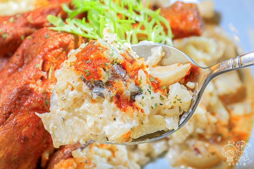燉飯上的菇類是以橄欖油炸的秀珍菇,搭配使用牛肝菌菇下去調味的白醬飯體,不但擁有飽滿的蕈菇香氣,尾韻還有獨特的木質風味,吃起來爽口又不濃膩。