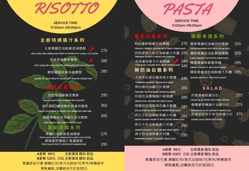 義大利麵有番茄紅醬、鮮奶油白醬、羅勒青醬、蒜香橄欖油清炒、主廚特調醬汁系列,不想吃太多澱粉的朋友也有三款沙拉能夠嚐鮮,另外多人聚餐也很適合可以點些開胃小點一起分享。