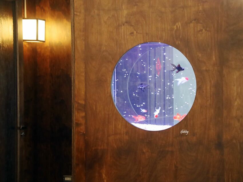 玉虫画室在玄關設置了金魚裝置藝術,阻隔裡外的水族牆面,有著活靈靈的金魚,真的超吸睛!而圓形的框架設計,令兩邊都有透視感,卻也都像畫一般,生動極了!