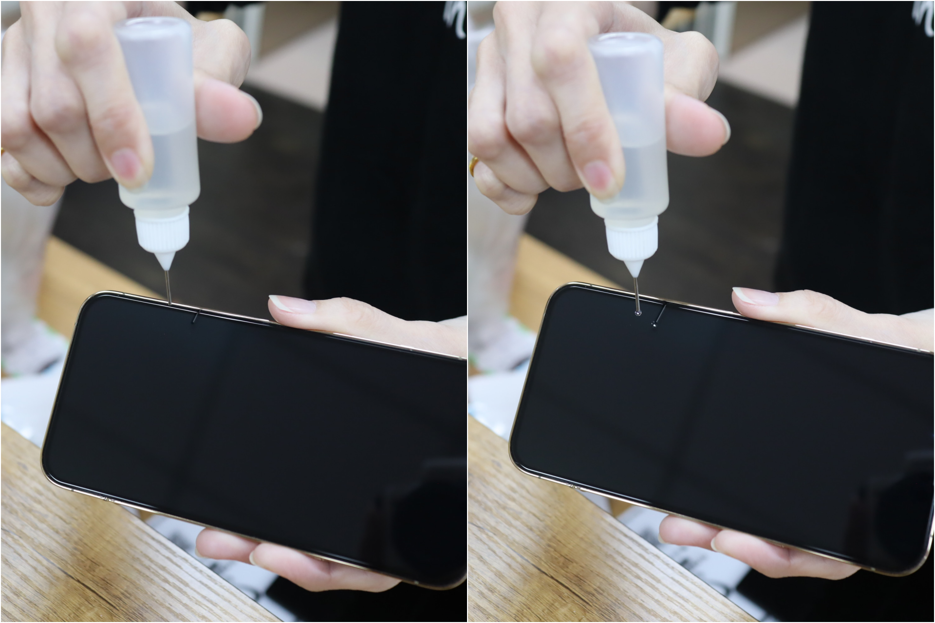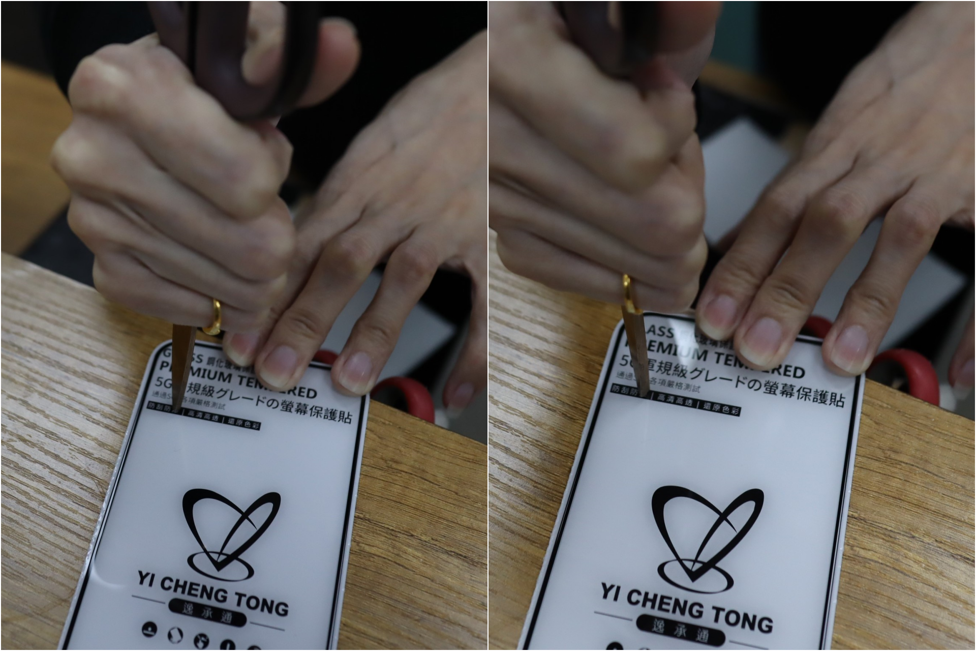店家拿剪刀直接實驗給我們看!完全不客氣的直接拿剪刀尖端用力敲擊汎金盾5G軍規級營幕保護貼