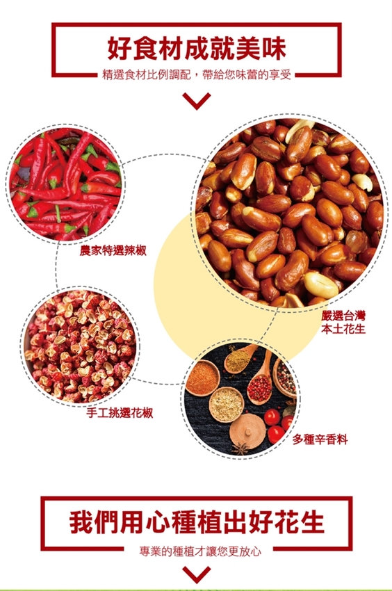 選用台灣生產的花生與大紅袍辣椒等香炒的美味