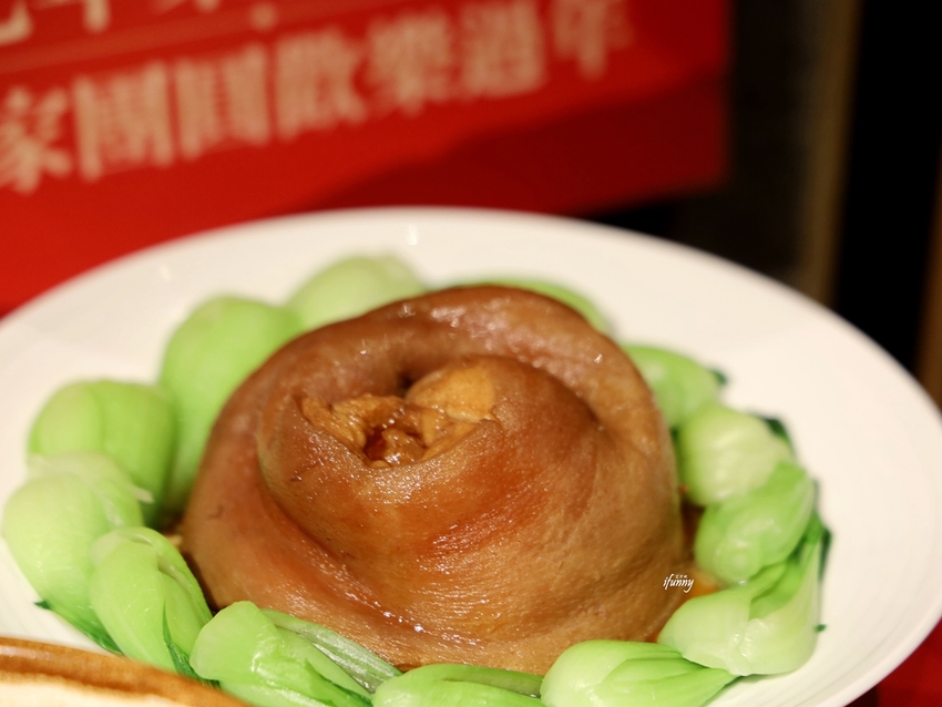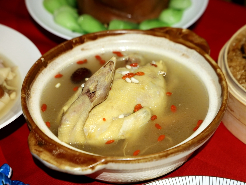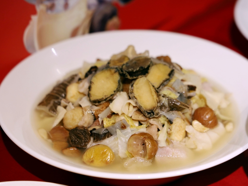 特別將佛跳牆甕中的食材改以盤盛裝,讓大家可以清楚地見到精選數十種食材,其中含有整顆鮑魚及生干貝,湯頭醇厚海味十足。